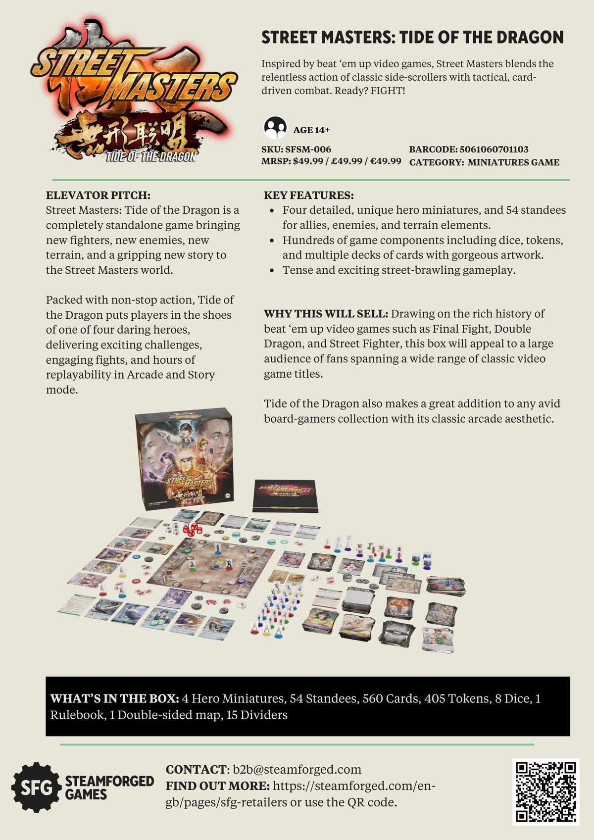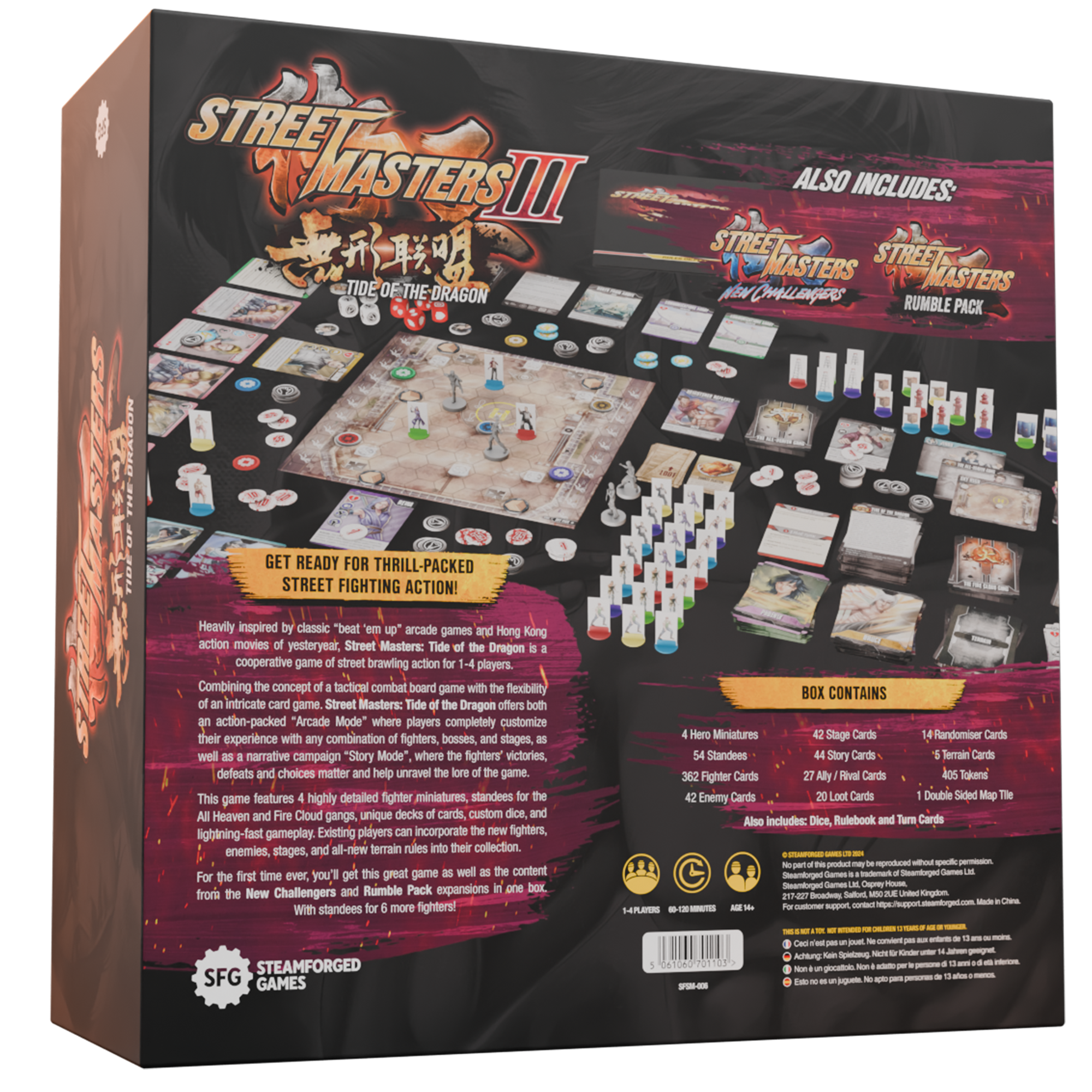 With four highly detailed fighter miniatures, standees for the All Heaven and Fire Cloud gangs, custom dice, and lightning fast gameplay, Tide of the Dragon will test your street-fighting skills. Plus, get all the content from the New Challengers and Rumble Pack expansions, with standees for 6 more fighters!