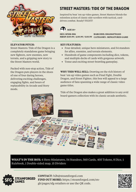 Get set for cooperative, street-brawling action in this beat ‘em up board game for 1-4 players! Inspired by retro arcade and video games, Street Masters: Tide of the Dragon blends the non-stop action of classic side-scrollers with tactical, card-driven combat.