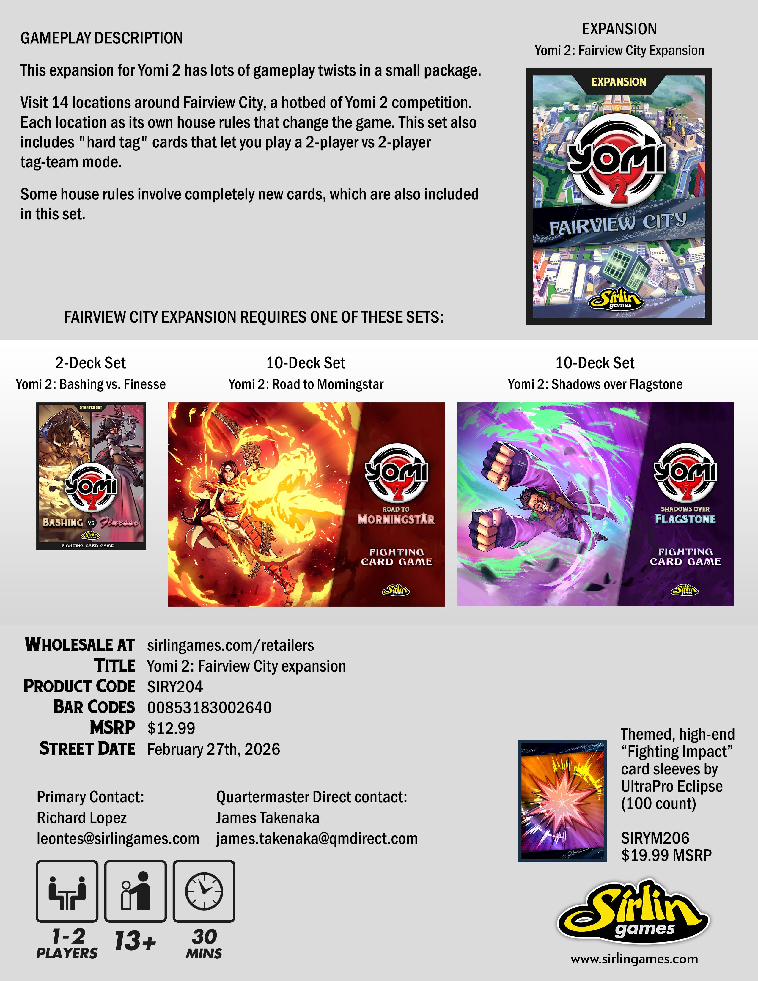 Visit 12 locations around Fairview City, a hotbed of Yomi 2 competition. Each location as its own house rules that change the game. This set also includes "hard tag" cards that let you play a 2-player vs 2-player tag-team mode.