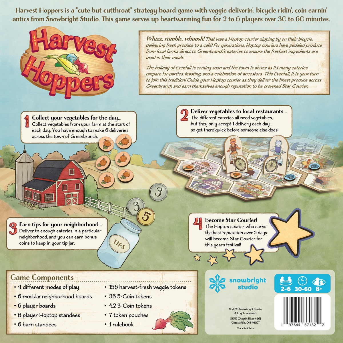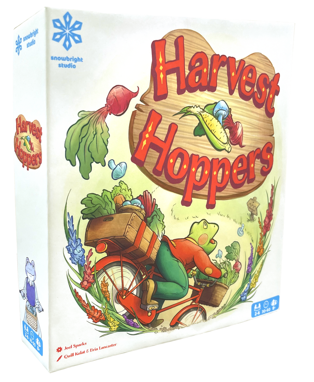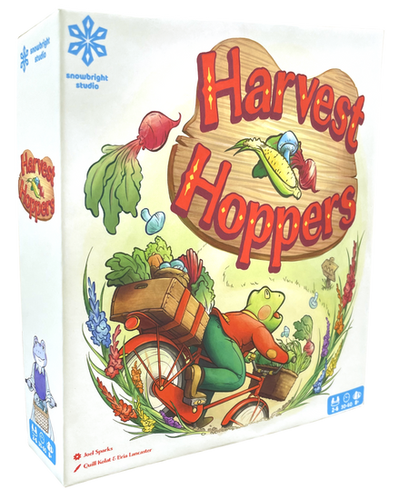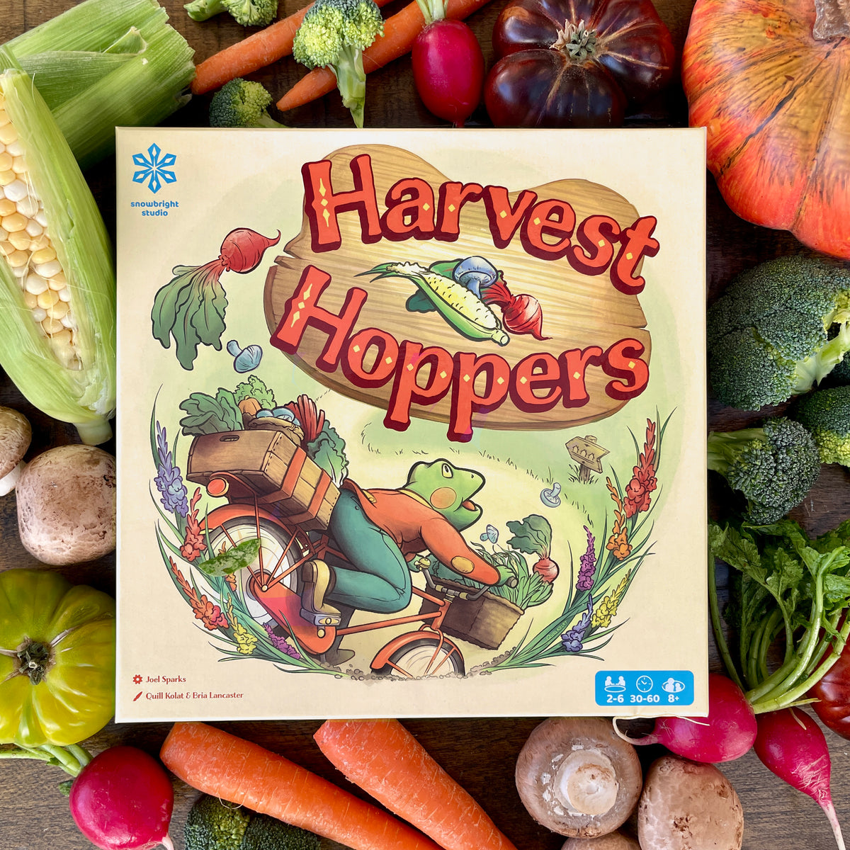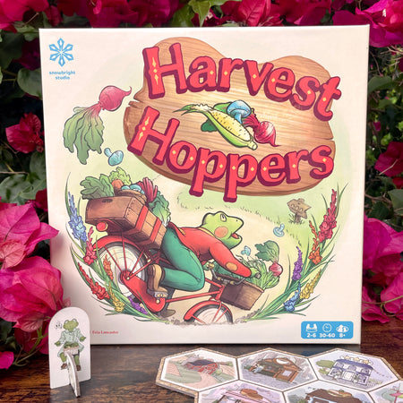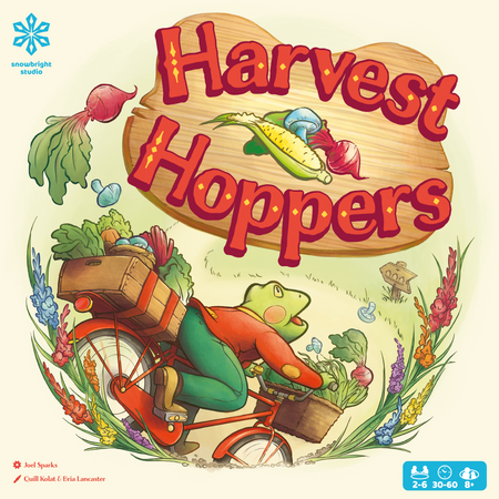 Harvest Hoppers is Snowbright Studio’s "tasty but strategic" vegetable delivery board game, serving up heartwarming fun for 2 to 6 players over 30 to 60 minutes. This “frogs on bikes” game comes with dozens of produce tokens, adorable Hoptop courier and barn standees, and a heapin’ handful of adorable bicycle delivery antics.