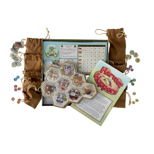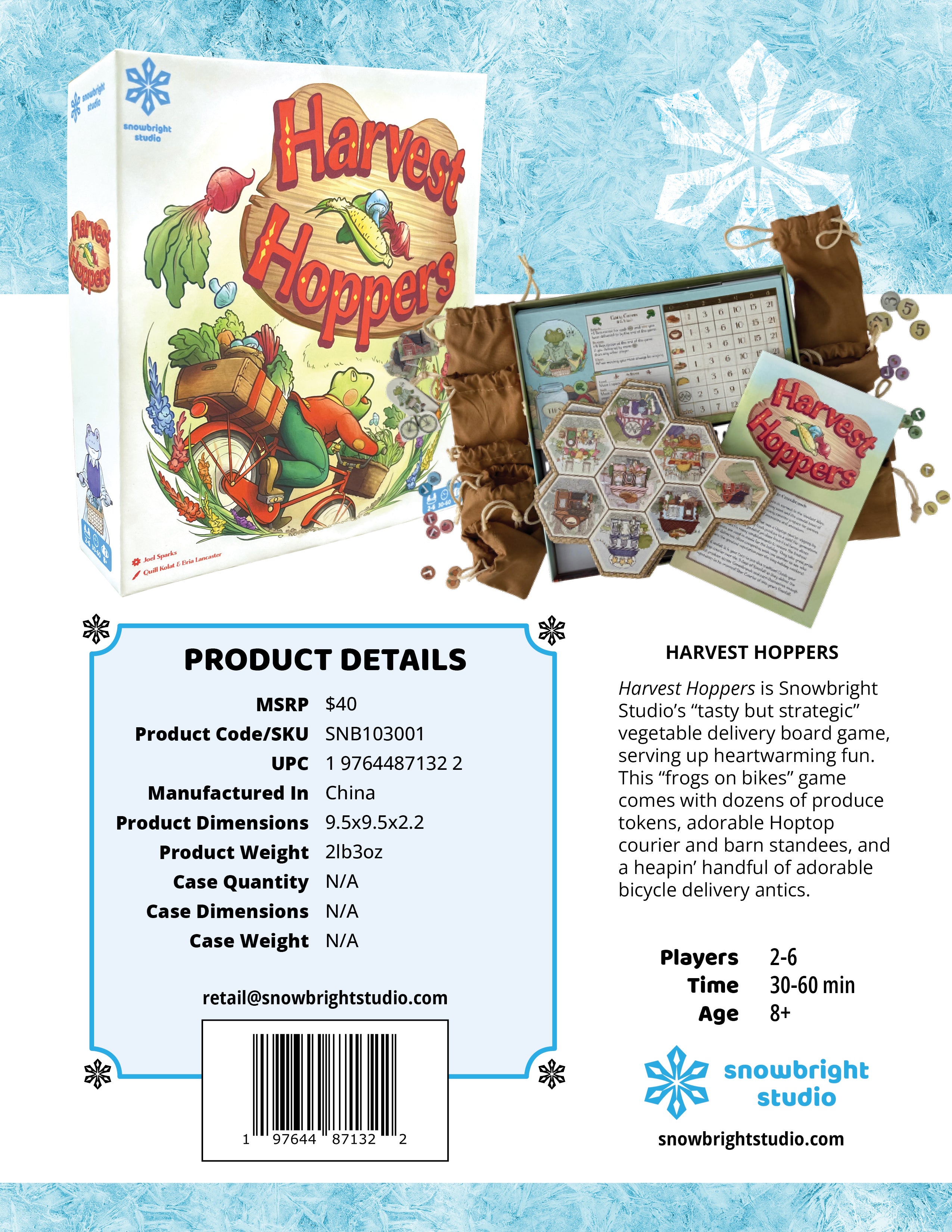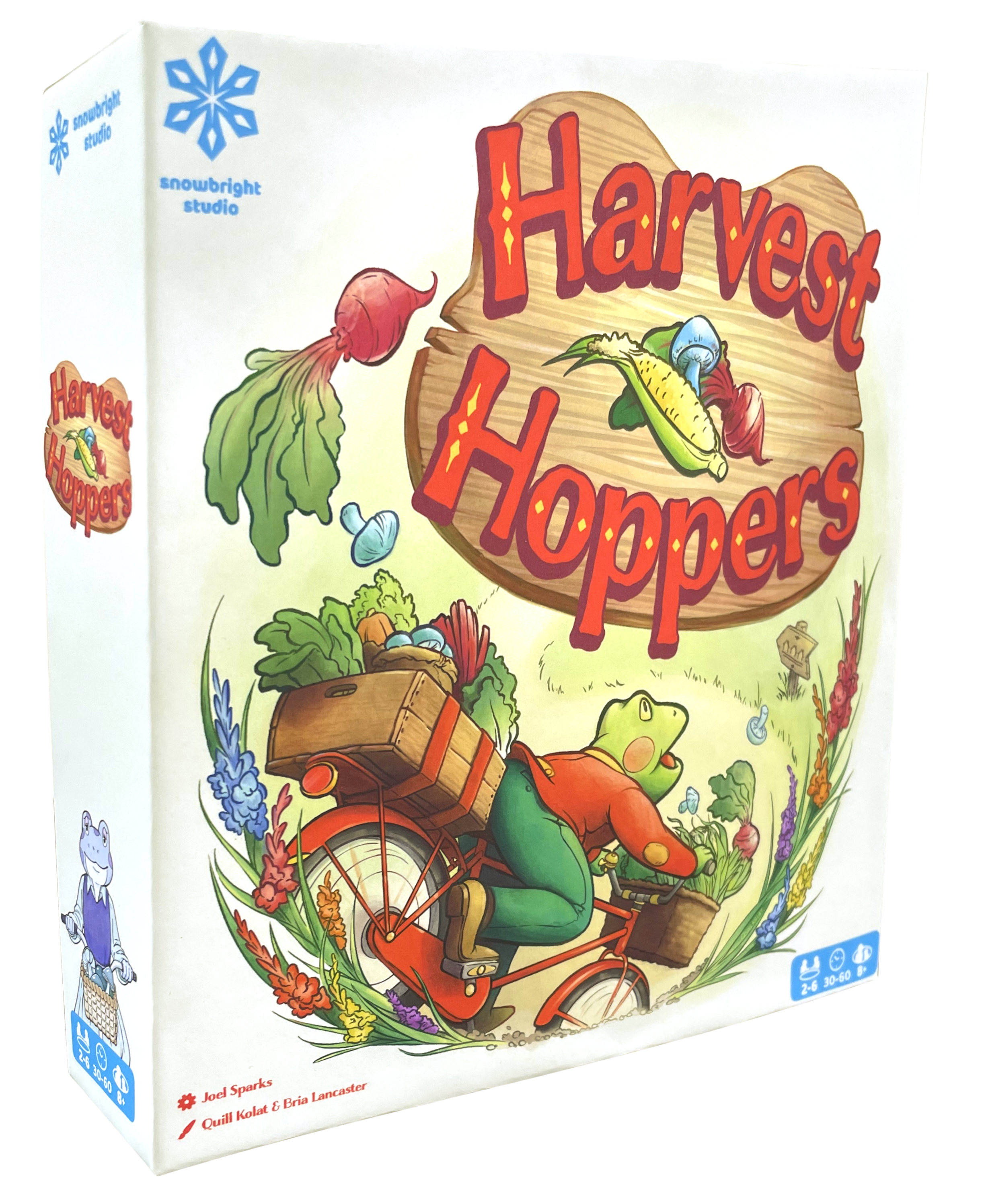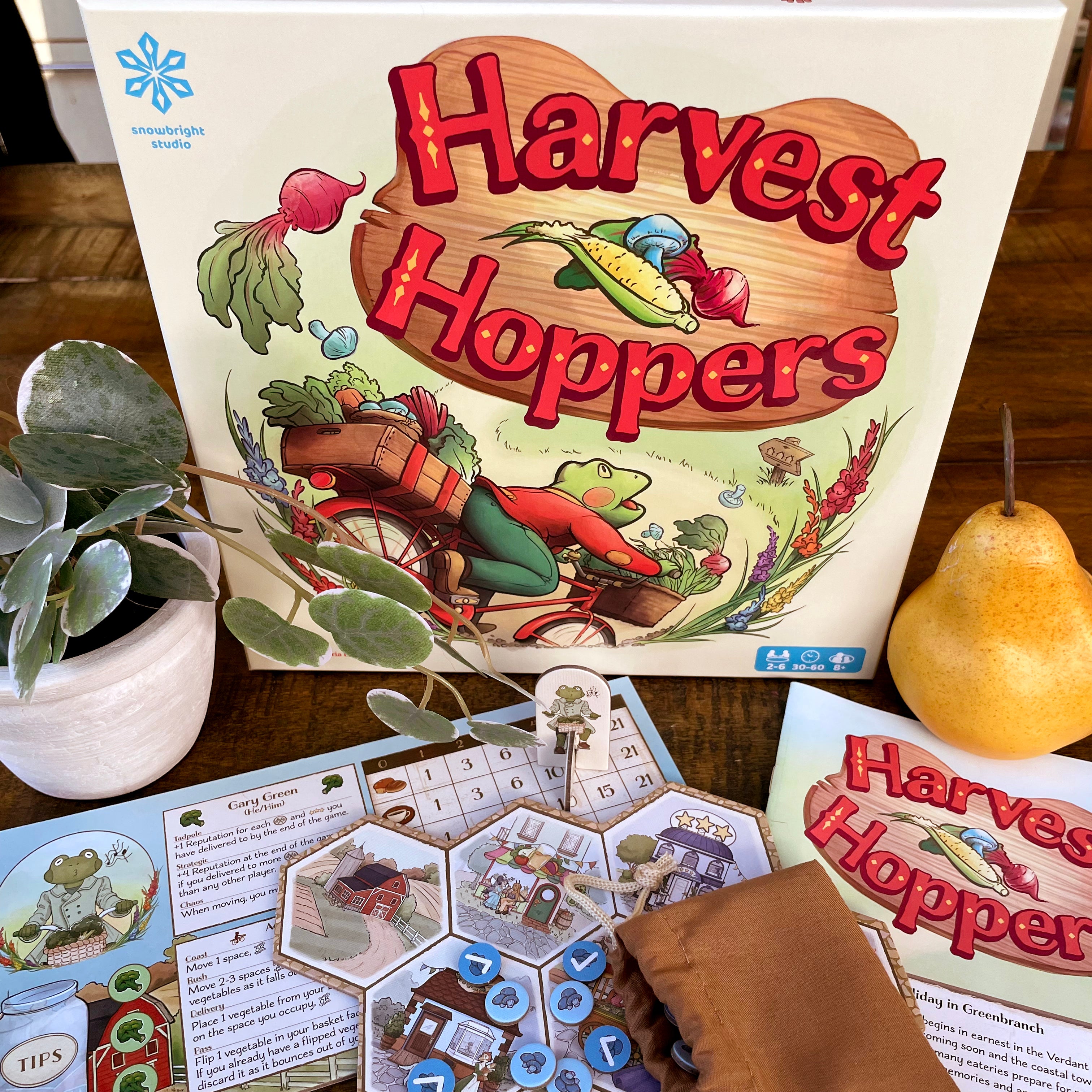 Harvest Hoppers is Snowbright Studio’s "tasty but strategic" vegetable delivery board game, serving up heartwarming fun for 2 to 6 players over 30 to 60 minutes. This “frogs on bikes” game comes with dozens of produce tokens, adorable Hoptop courier and barn standees, and a heapin’ handful of adorable bicycle delivery antics.