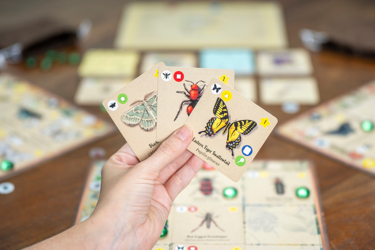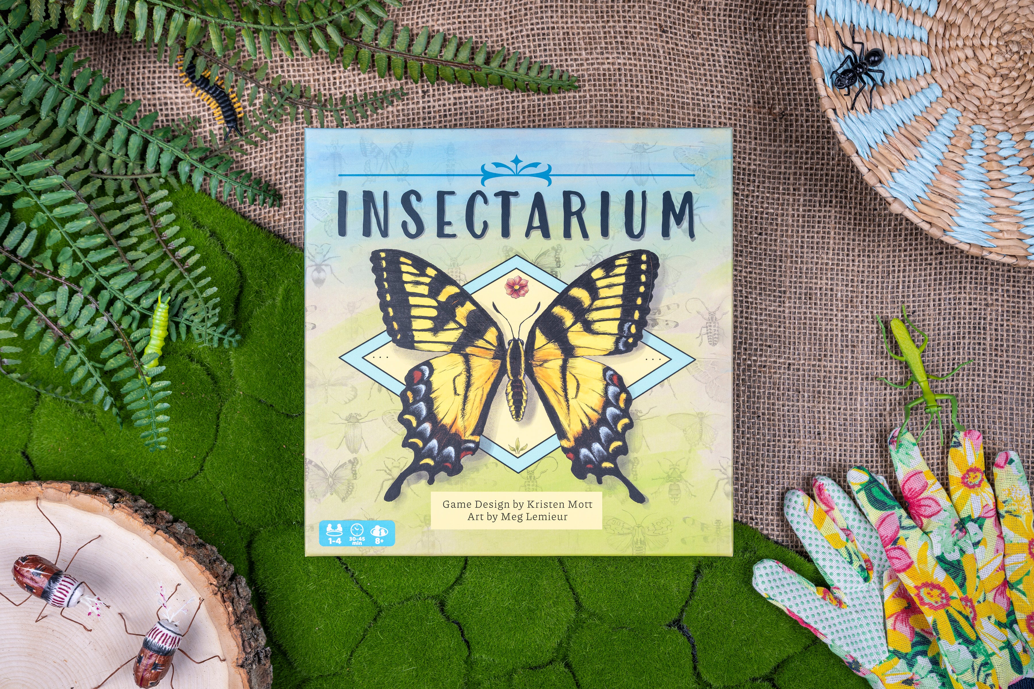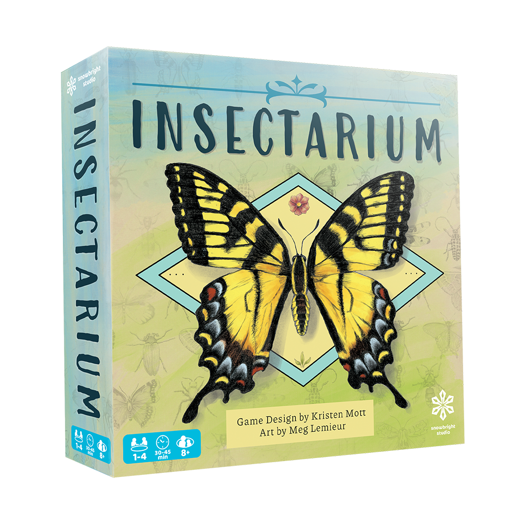 Welcome to the Insectarium, a museum of insects! You are tasked with creating a board of insect specimens for display in the Insectarium’s main hall. You must use your gear, gather specimens, and collect tools to precisely arrange and pin your specimens in your display in this family strategy board game for 1 to 4 players over 30 to 45 minutes.