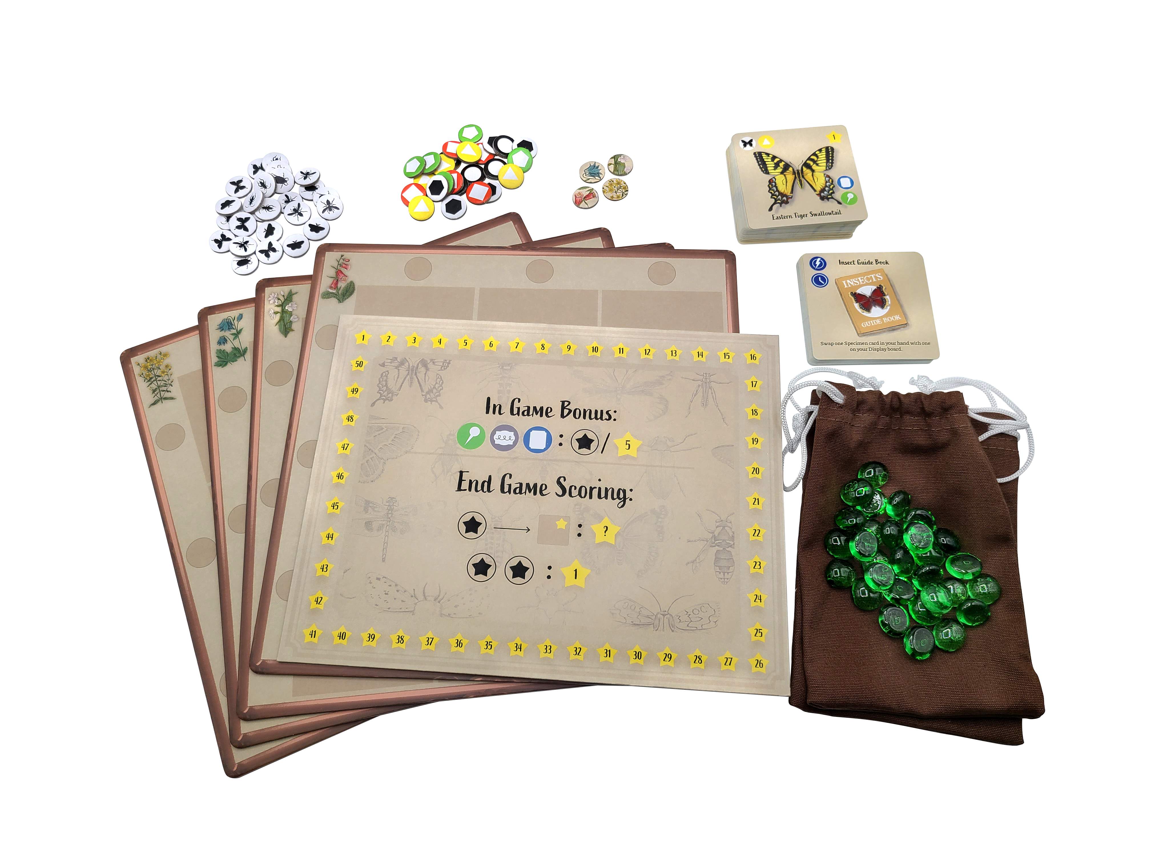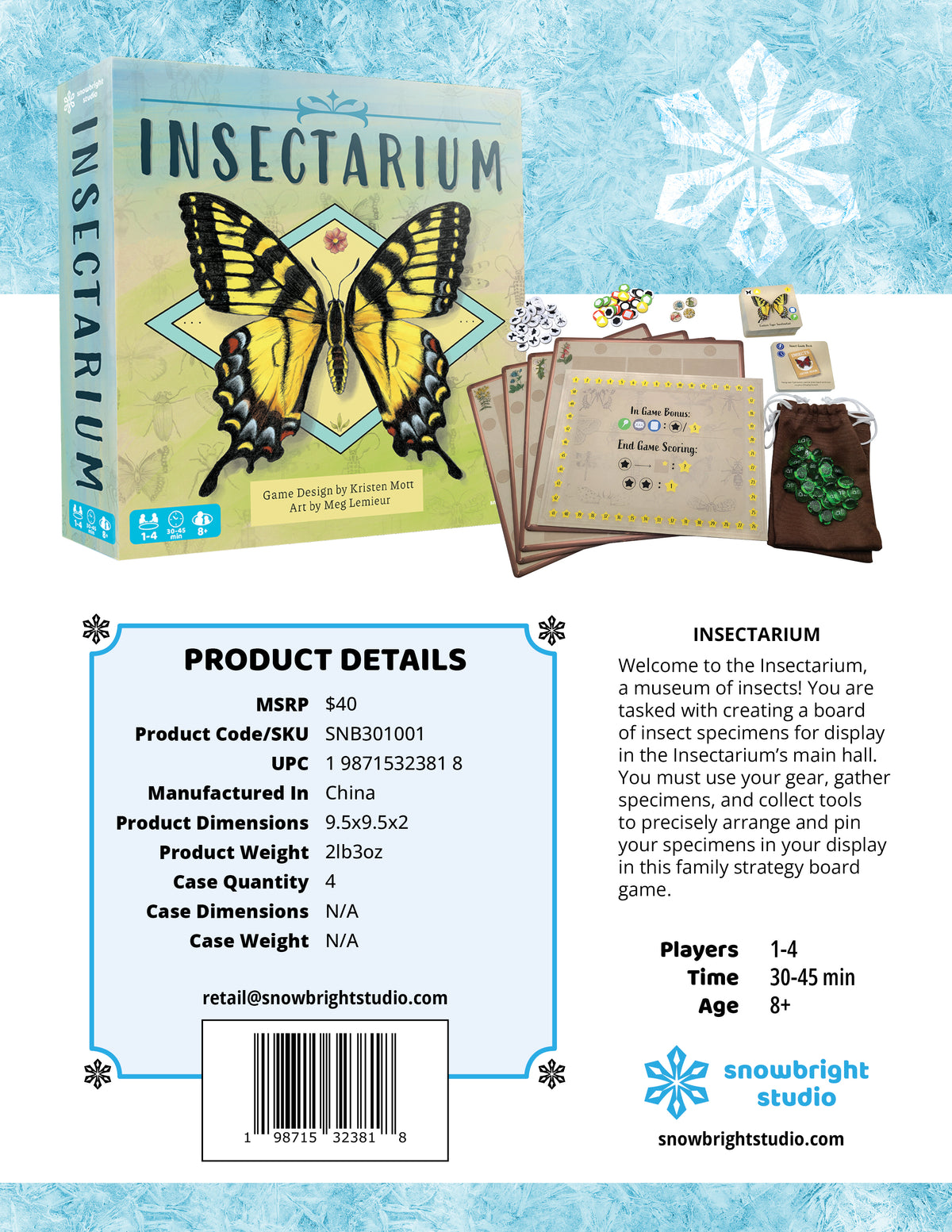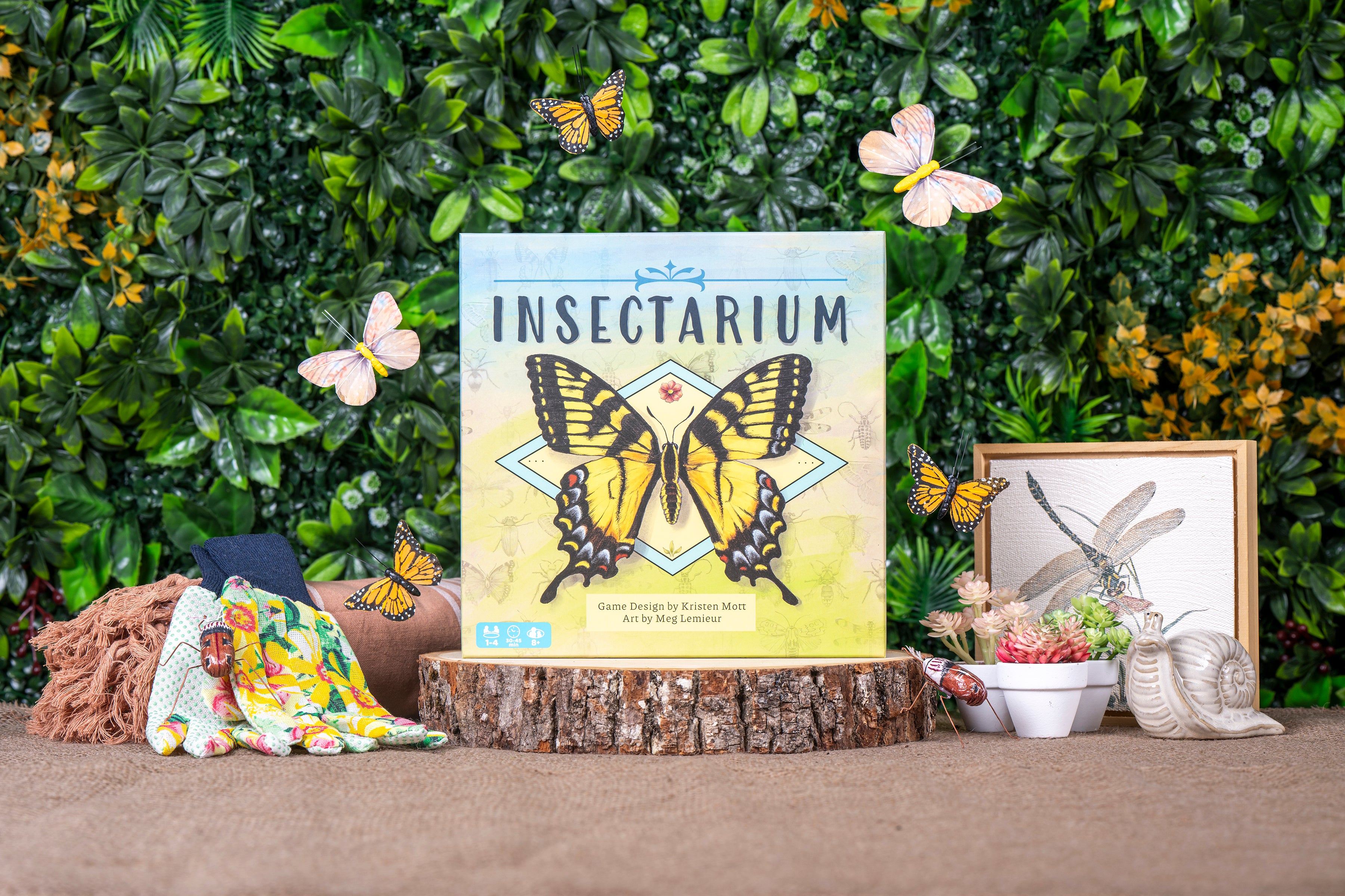 Welcome to the Insectarium, a museum of insects! You are tasked with creating a board of insect specimens for display in the Insectarium’s main hall. You must use your gear, gather specimens, and collect tools to precisely arrange and pin your specimens in your display in this family strategy board game for 1 to 4 players over 30 to 45 minutes.