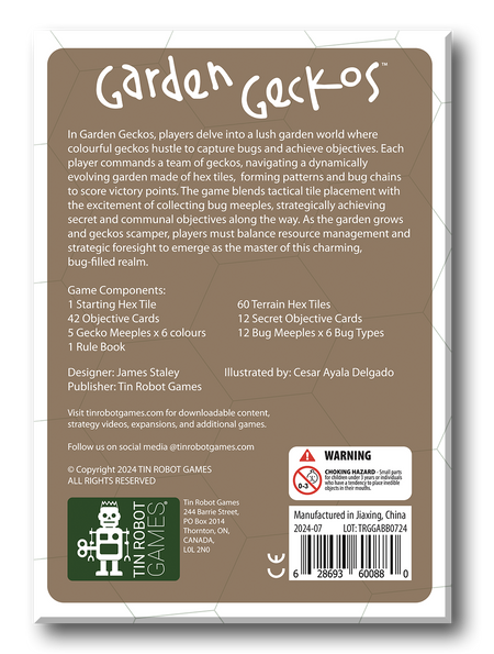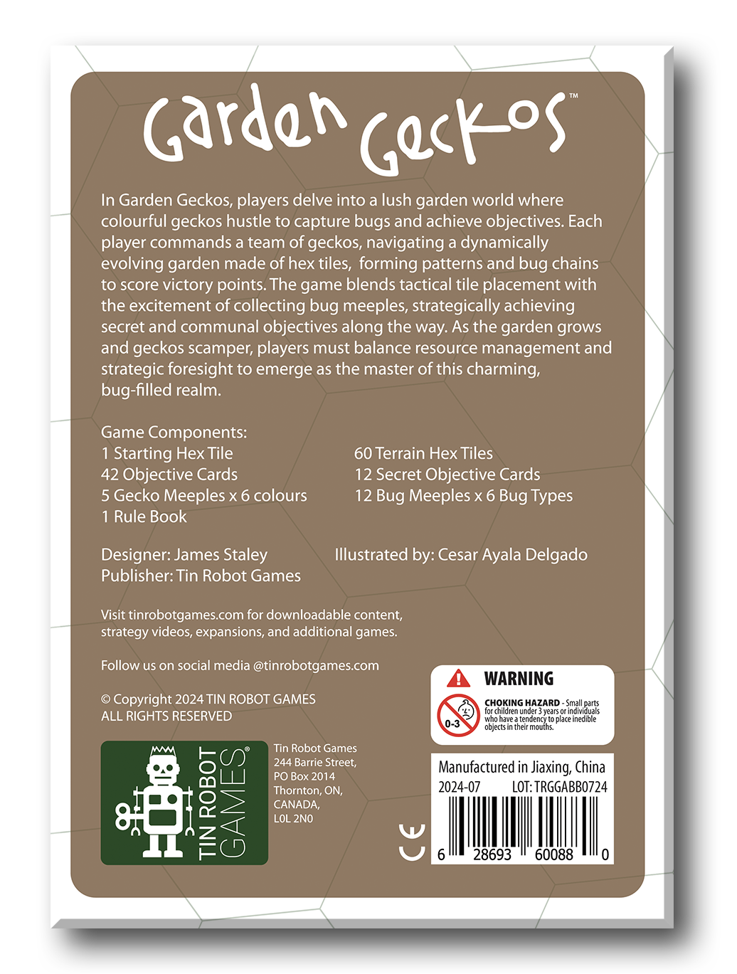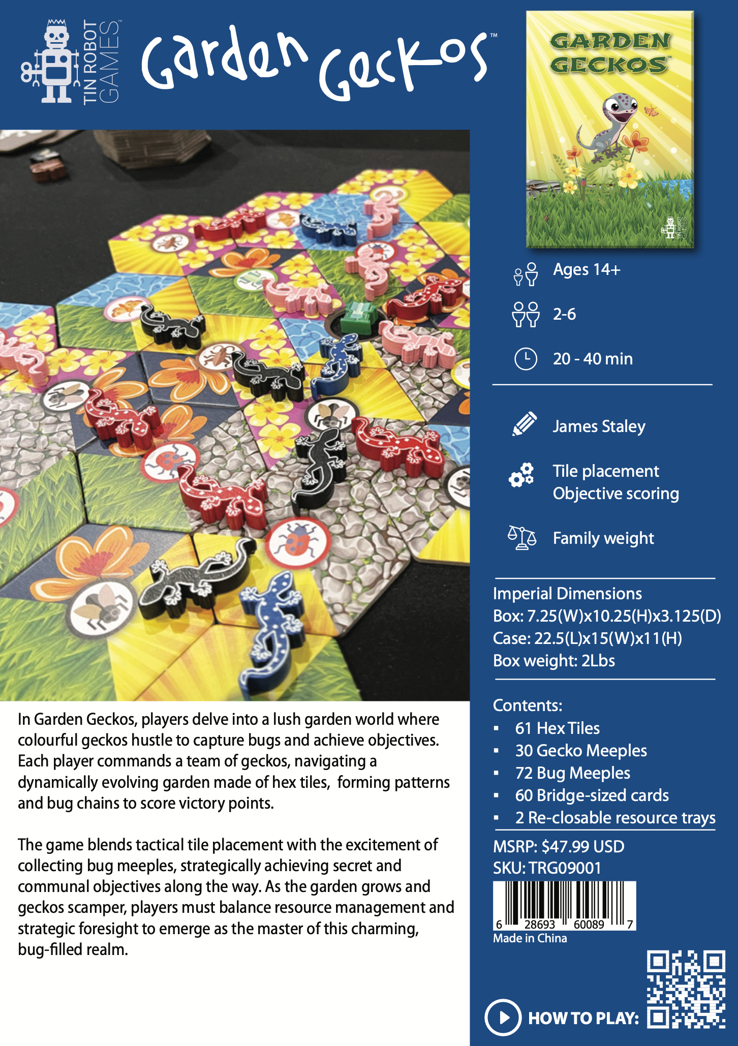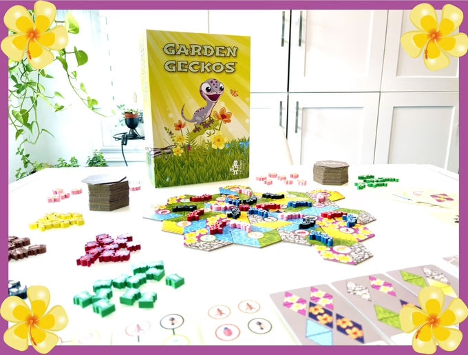 In Garden Geckos, players delve into a lush garden world where colorful geckos hustle to capture bugs and achieve objectives. Each player commands a team of geckos, navigating a dynamically evolving garden made of hex tiles, forming patterns and bug chains to score victory points. The game blends tactical tile placement with the excitement of collecting bug meeples, strategically achieving secret and communal objectives along the way. As the garden grows and geckos scamper, players must balance resource management and strategic foresight to emerge as the master of this charming, bug-filled realm.