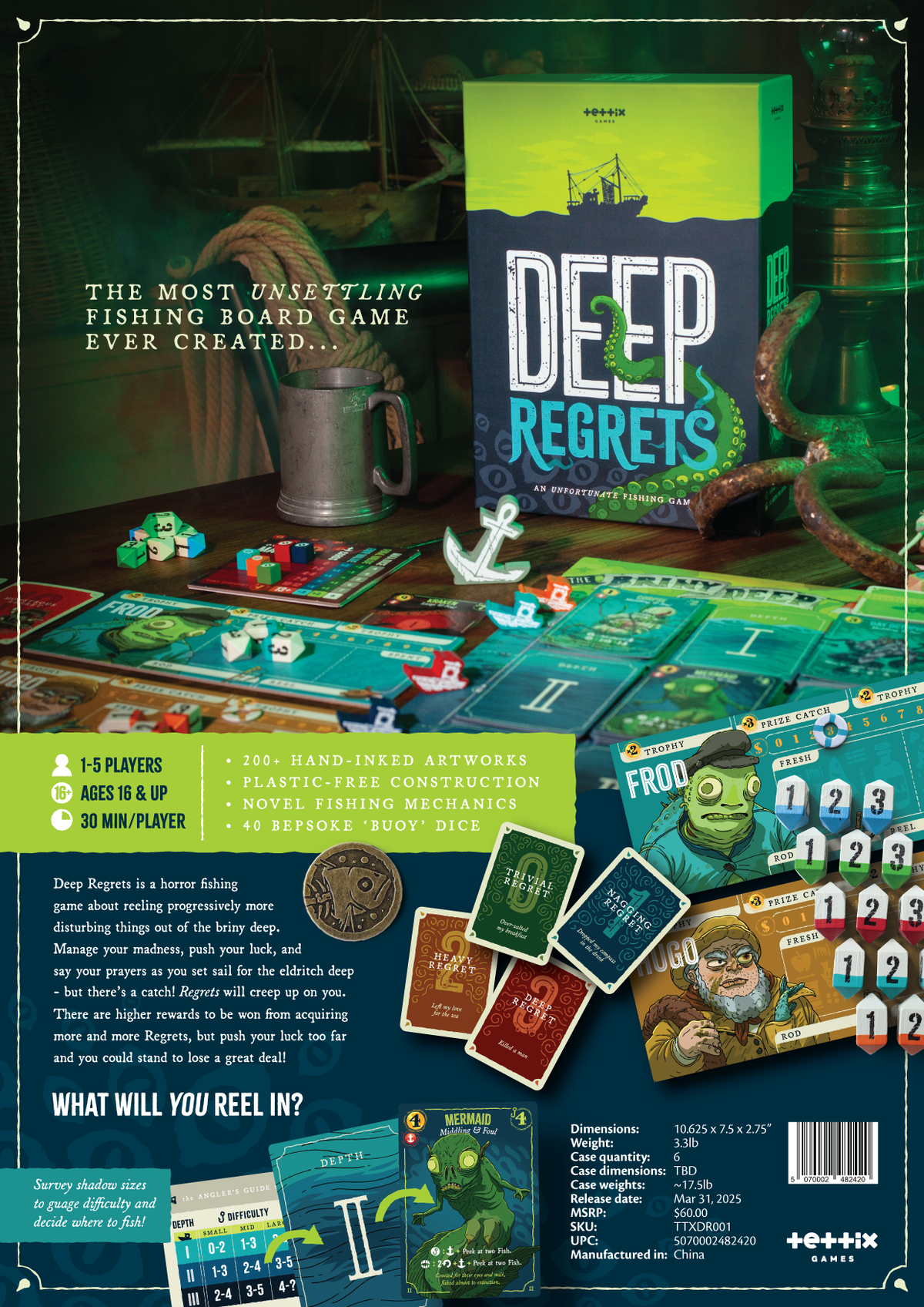 Manage you resources, make strategic decisions, leverage madness to your benefit and suppress your Regrets as you try to catch the most valuable haul of weirder and weirder fish on this thrilling week at sea.