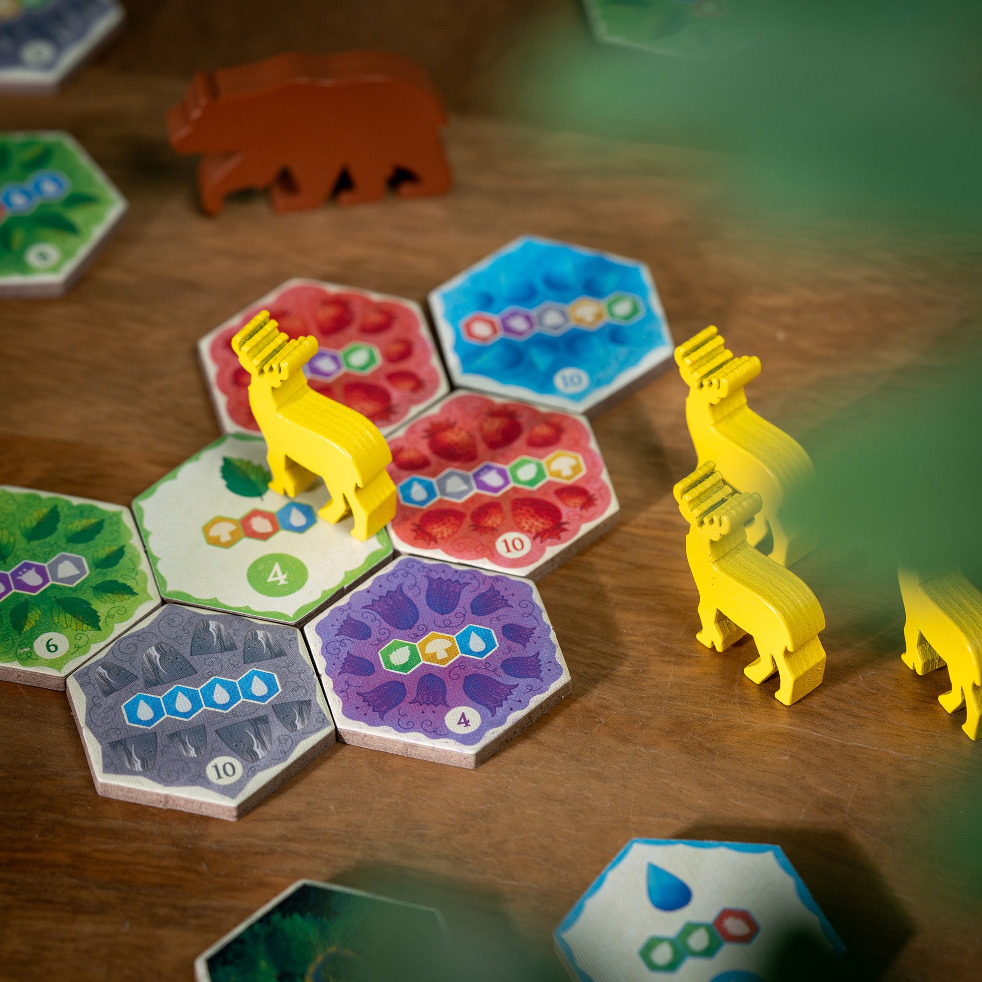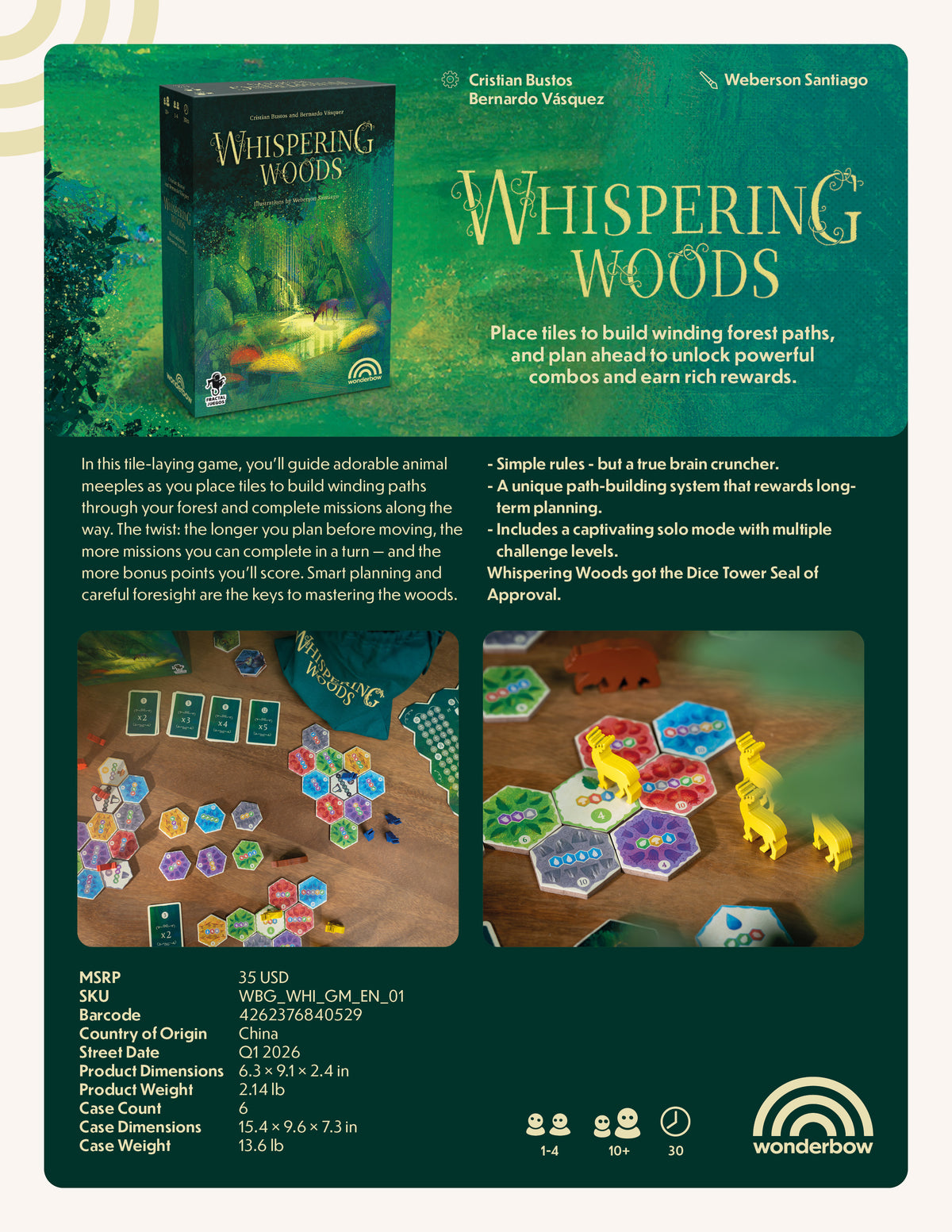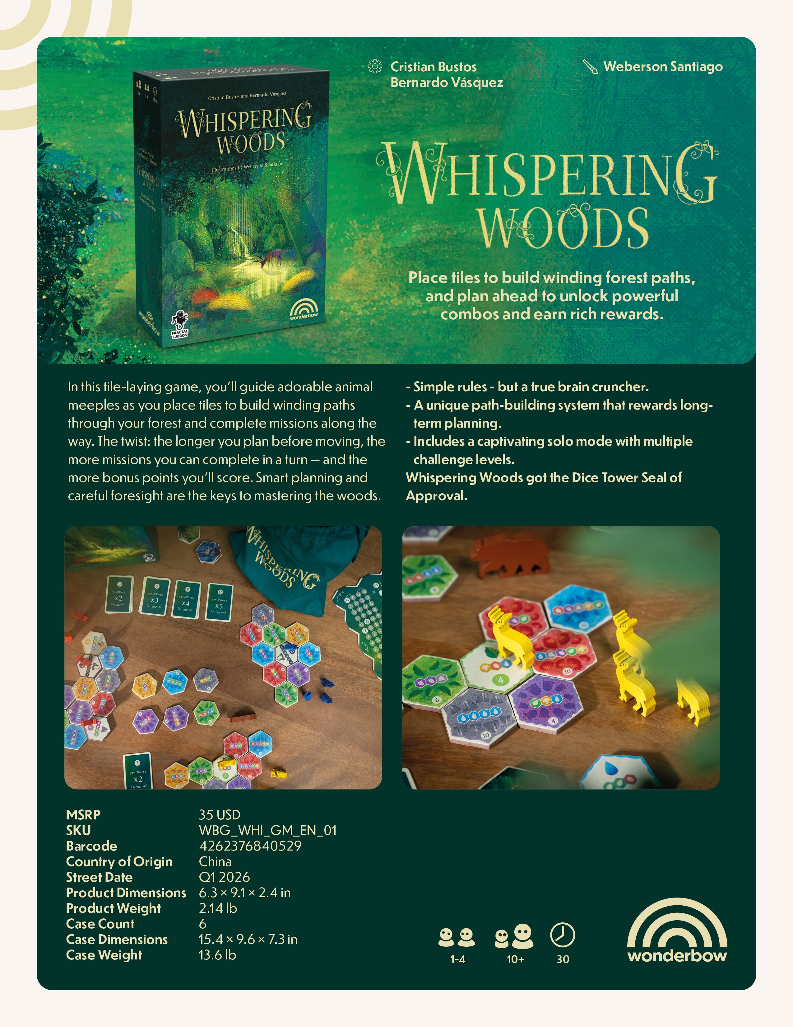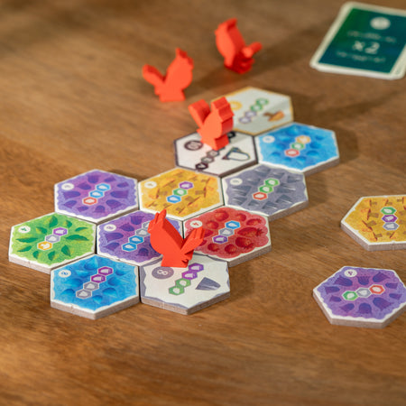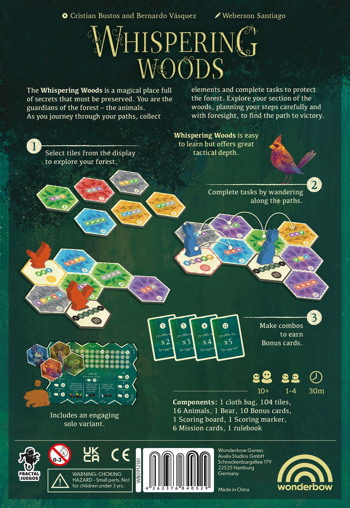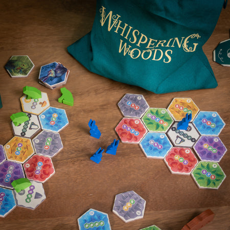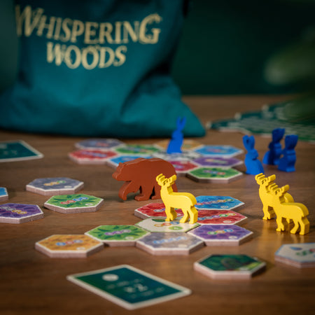 The Whispering Woods are a magical place full of secrets, stories, and strategic surprises. In this tile-laying game, you’ll guide adorable animal meeples as you place tiles to build winding paths through your forest and complete missions along the way.Here’s the twist: the longer you plan your paths before moving, the more missions you can complete in a single turn — and the more bonus points you’ll score. Smart planning and careful foresight are the keys to mastering the woods.