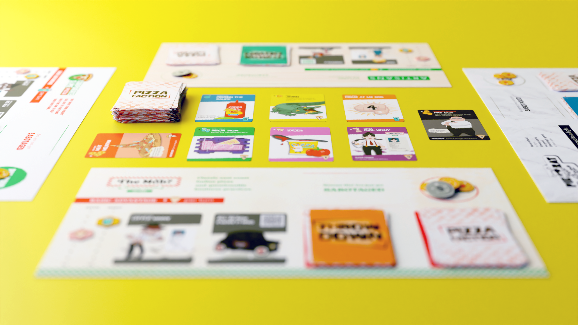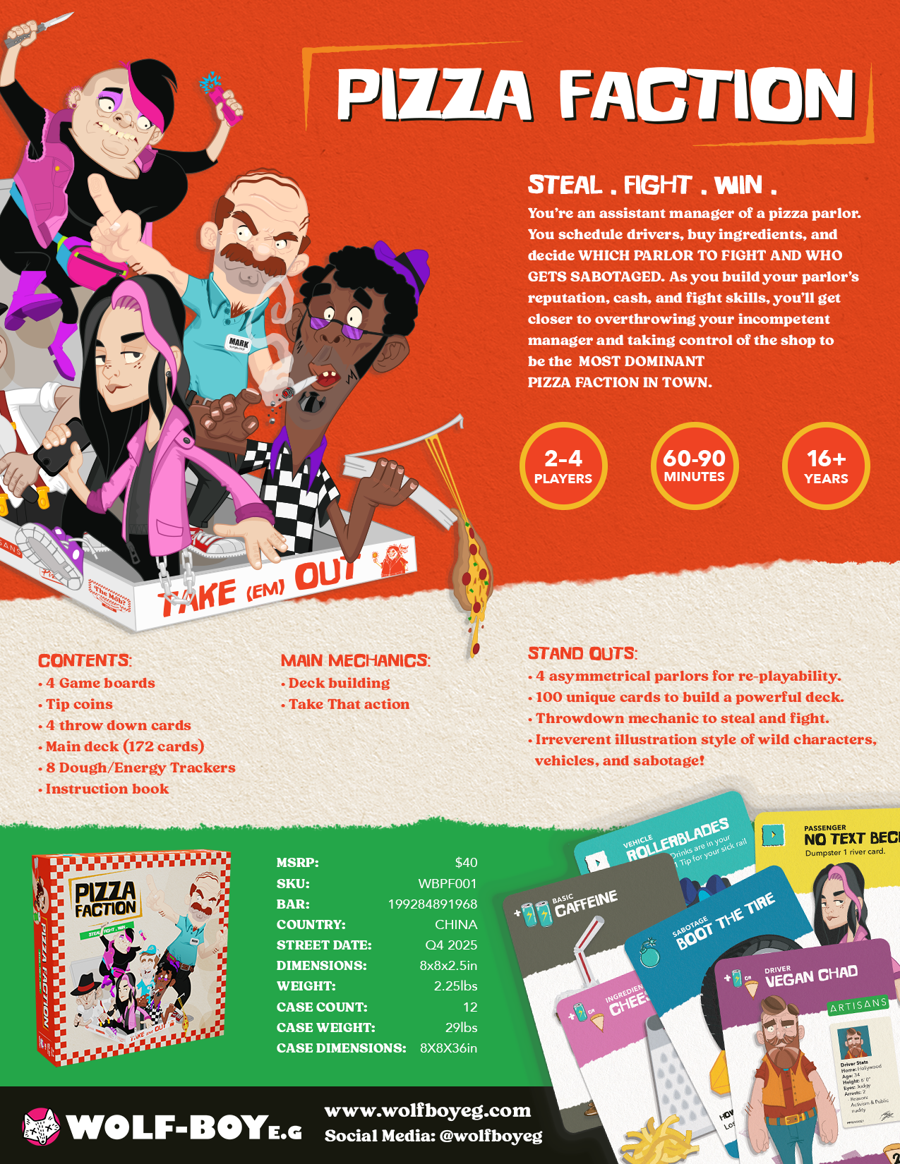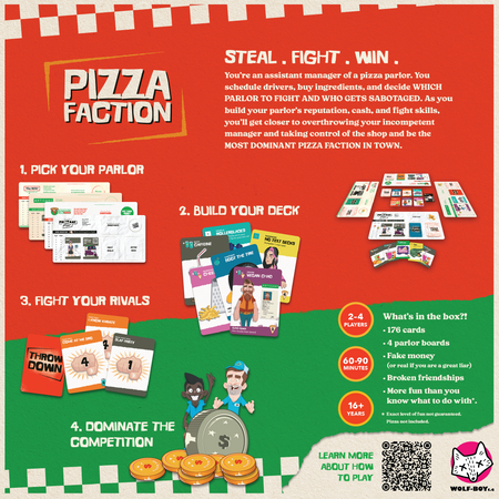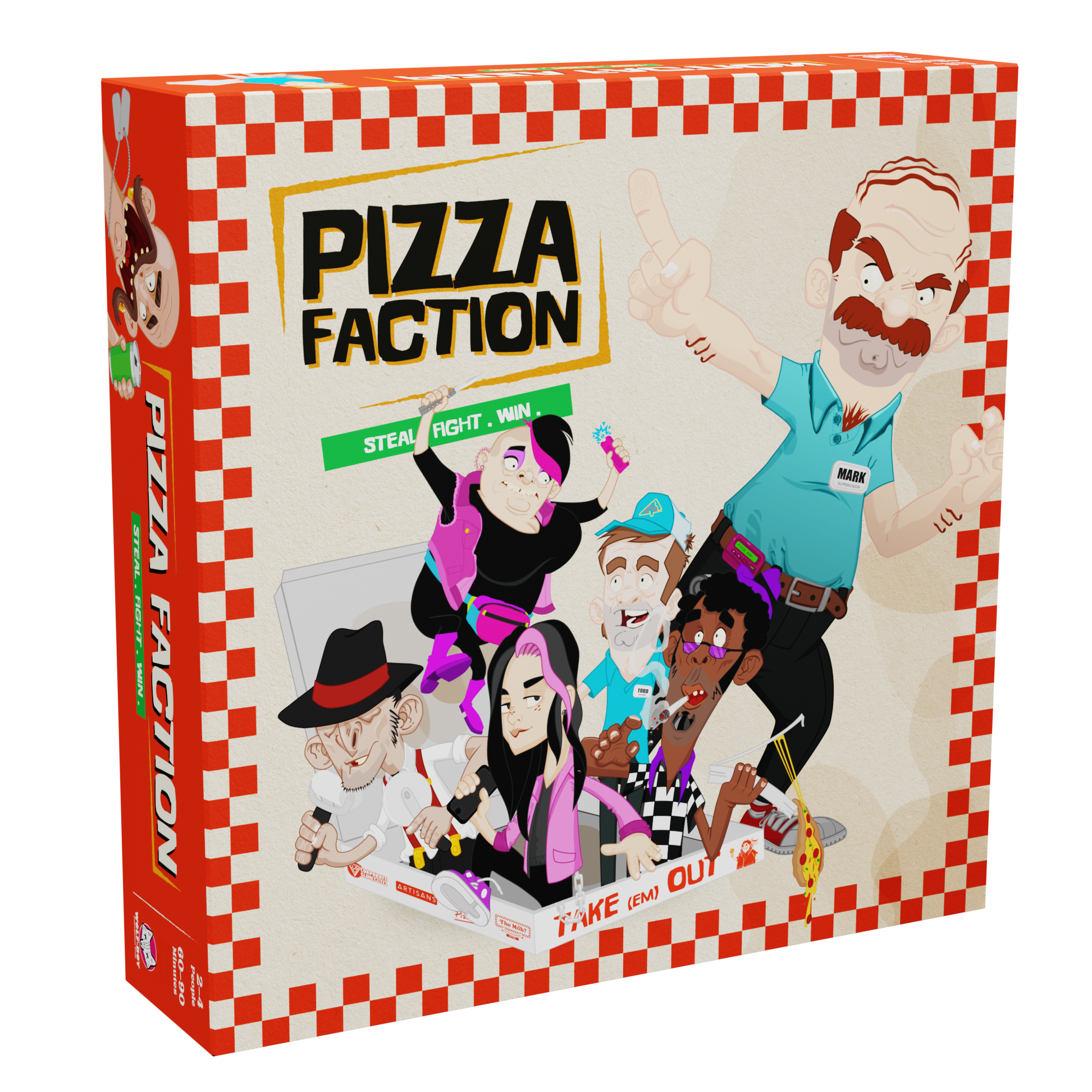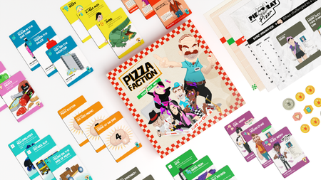 Pizza Faction is an irreverent, interaction-packed deck-builder where players compete to be the first pizza parlor to earn $20 in tips. Expect strategic deck building, playful sabotage, and boisterous throwdowns to fight other players for their hard earned tips. With its humorous tone and take-that mechanics, Pizza Faction brings lively competition and nonstop laughter to the table.