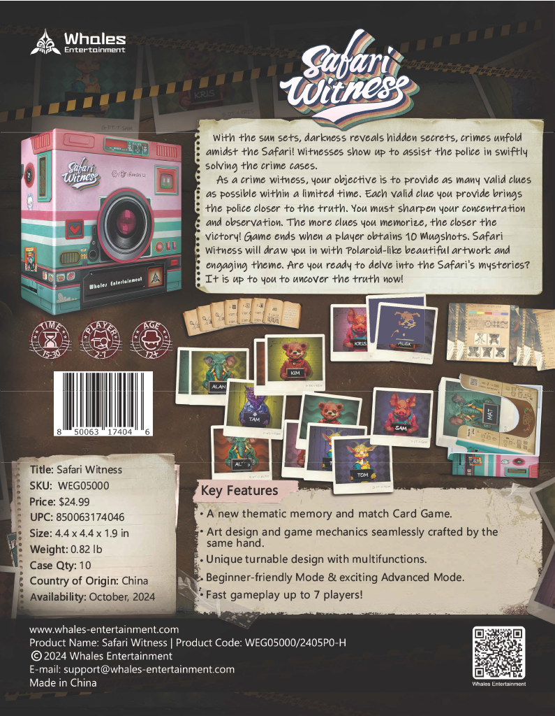 With the sun sets, darkness reveals hidden secrets, crimes unfold amidst the Safari! Witnesses show up to assist the police in swiftly solving the crime cases. As a crime witness, your objective is to provide as many valid clues as possible within a limited time. Each valid clue you provide brings the police closer to the truth. You must sharpen your concentration and observation. The more clues you memorize, the closer the victory! Game ends when a player obtains 10 Mugshots. Safari Witness will draw you in with Polaroid-like beautiful artwork and engaging theme. Are you ready to delve into the Safari's mysteries? It is up to you to uncover the truth now!