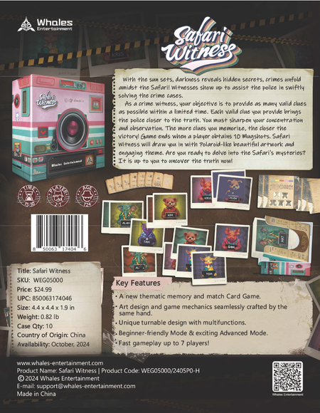 With the sun sets, darkness reveals hidden secrets, crimes unfold amidst the Safari! Witnesses show up to assist the police in swiftly solving the crime cases. As a crime witness, your objective is to provide as many valid clues as possible within a limited time. Each valid clue you provide brings the police closer to the truth. You must sharpen your concentration and observation. The more clues you memorize, the closer the victory!Game ends when a player obtains 10 Mugshots. Safari Witness will draw you in with Polaroid-like beautiful artwork and engaging theme. Are you ready to delve into the Safari's mysteries? It is up to you to uncover the truth now!
