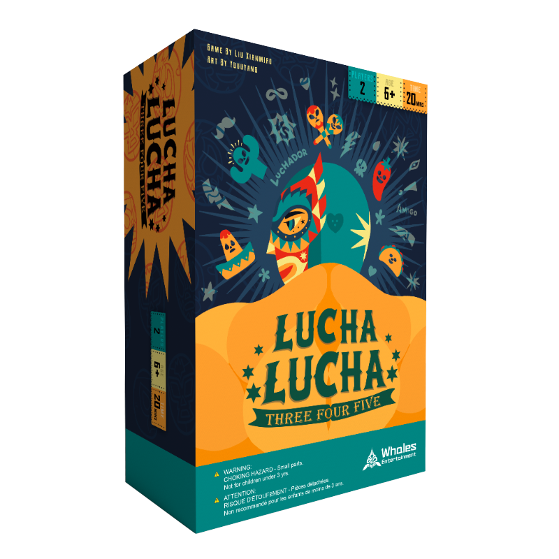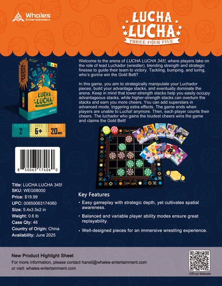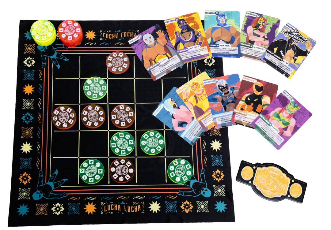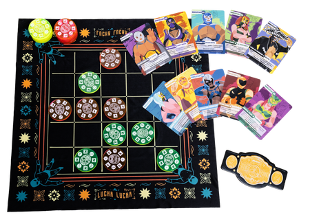 As you embark on this game, players take turns to move their Luchador pieces to Lucha! and try to form as many of their advantage stacks as possible. After moving one of the advantage stacks through several empty spaces until it Lucha, the moved stack will stack onto an opponent's advantage stack and resolve the outcome. The game ends when neither of the players can Lucha! anymore. Then calculate how many cheers each player has received; whoever receives the most cheers wins the game and the Gold Belt!